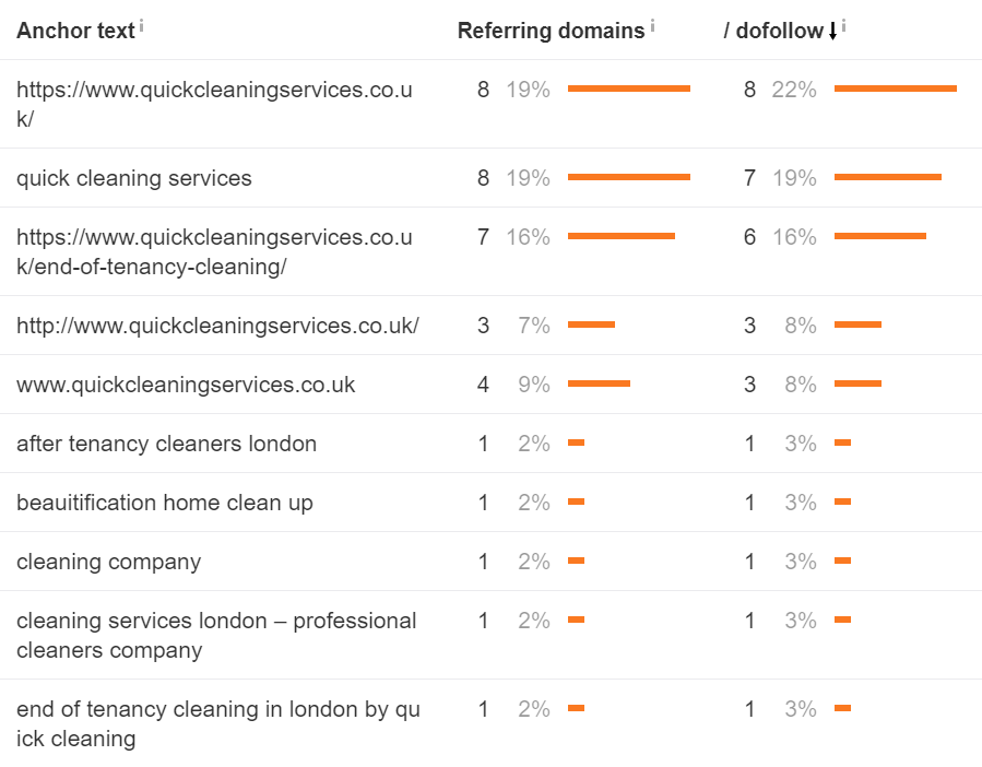 Wir haben uns nur auf Markenanker und die nackten URL-Links konzentriert. Für erfolgreiche SEO-Optimierung ist es wichtig das Linkbuilding strategisch zu planen, um negative SEO-Resultate zu vermeiden. Extrem umkämpfte Suchbegriffe wie “cleaning services”, “professional cleaning services”, “house cleaning services” dürfen nicht übermäßig verlinkt werden mit der Webseite, weil Suchmaschinen sonst annehmen, dass diese Links manipuliert sind, was in niedrigeren SERP Rängen resultieren kann.
