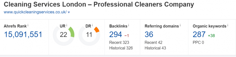 In der folgenden Grafik wird gezeigt, dass die Quick Cleaning Services Website nur 294 Backlinks von 36 verweisenden Domains hat, was nicht viel ist.